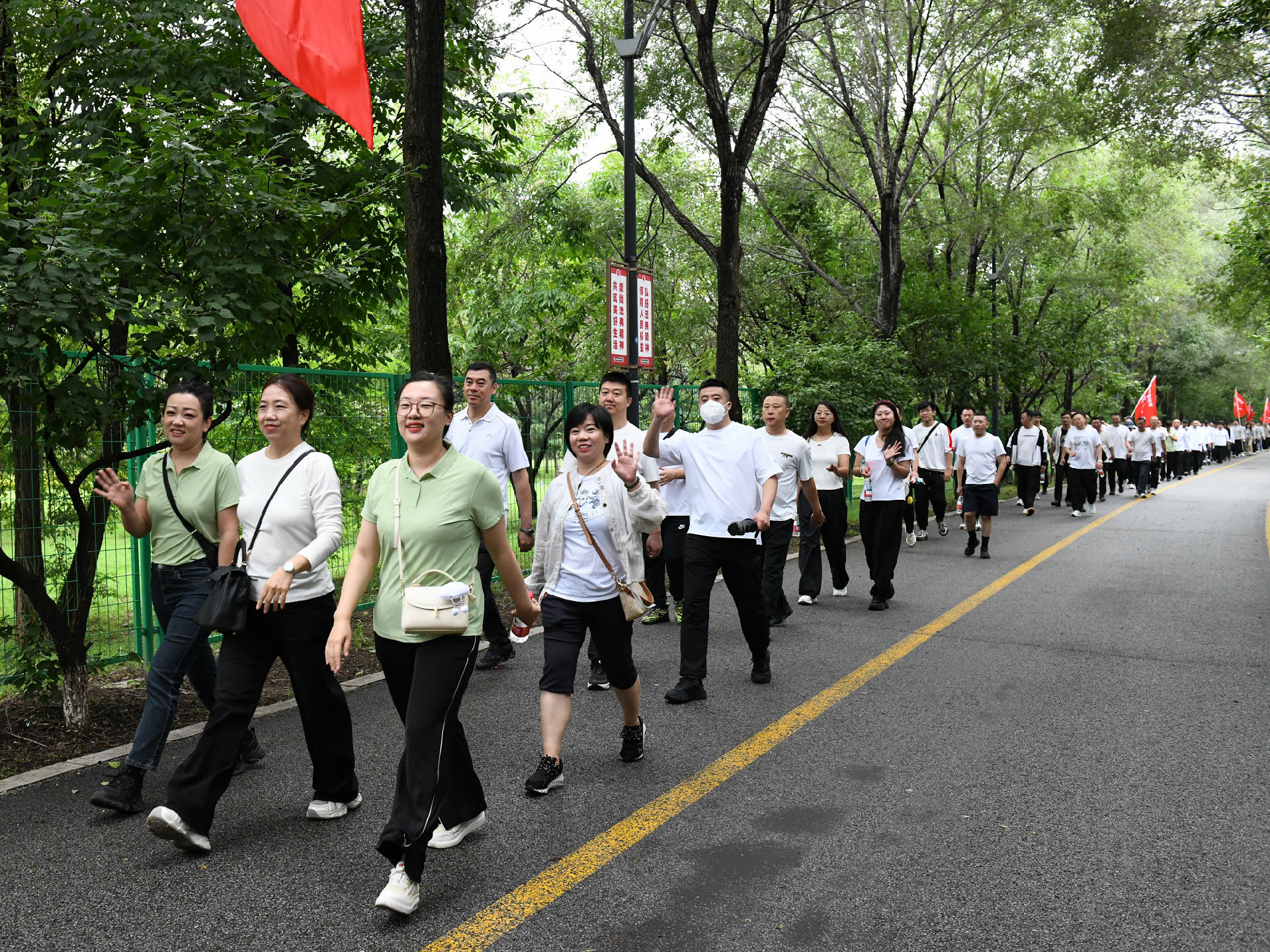 撫順特鋼第一副總經(jīng)理穆立峰為員工徒步健康行活動(dòng)發(fā)令。伴隨著發(fā)令聲,公司領(lǐng)導(dǎo)與400余名員工圍繞月牙島開(kāi)始5公里徒步健康行。一路上,大家揮舞隊(duì)旗、彩旗踏歌而行,每個(gè)人的臉上都洋溢著幸福的笑容。經(jīng)過(guò)一個(gè)多小時(shí)的努力,所有人都勝利到達(dá)終點(diǎn)。